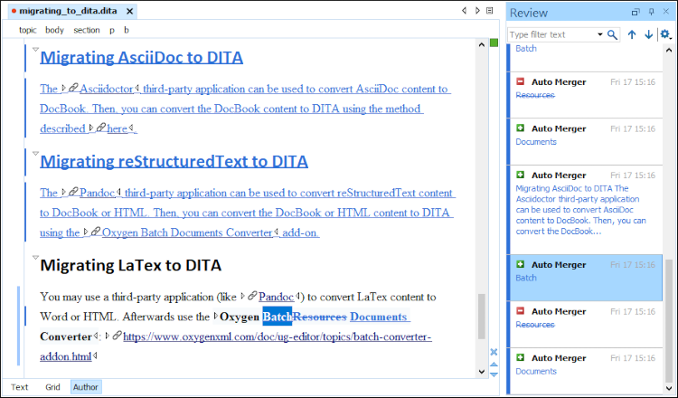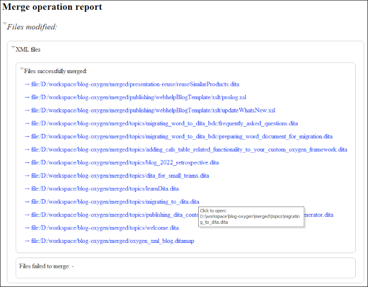 Step Result: The operation report should automatically open in Author mode. The listed URLs are actually links that will open the corresponding merged DITA file in the editor. You can inspect the changes and accept or reject them, individually or in bulk.