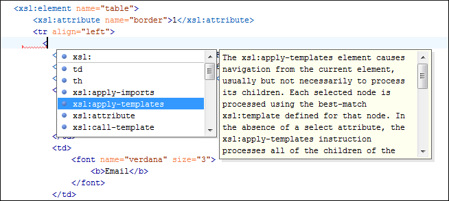 The Content Completion Assistant proposes numerous item types (such as templates, variables, parameters, keys, etc.) that are defined in the current stylesheet, and in the imported and included XSLT stylesheets. The Content Completion Assistant also includes code templates that can be used to quickly insert code fragments into stylesheets.