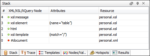 The Stack view shows the current execution stack of both source and XSLT/XQuery nodes. If the view is not displayed, it can be opened by selecting it from the menu.