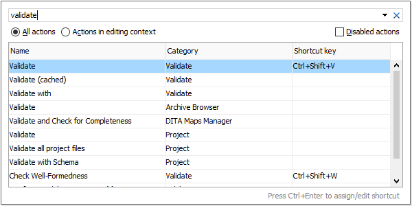 Oxygen XML Developer includes a Find action feature that provides a quick way to find actions that are available throughout the application. You can also assign shortcuts for particular actions and invoke actions using this feature.
