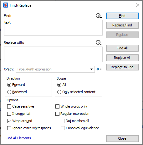 Note:This option is disabled if the XML document is not well-formed or if the XML document is large and opened using the large or huge file loading optimization feature.The XPath 2.0 expression you input in this combo is used for restricting the search scope. The cursor position does not affect the result of the XPath evaluation. The context of the XPath expression evaluation from the Find/Replace dialog box is the XML document root. The XPath is used for determining the intervals to be searched from the document, so the XPath result must be a node-set.Tip:You can use the Content Completion Assistant to help you input XPath expressions that are valid in the current context. See Working with XPath Expressions for more information and some common examples of how to write XPath expressions.