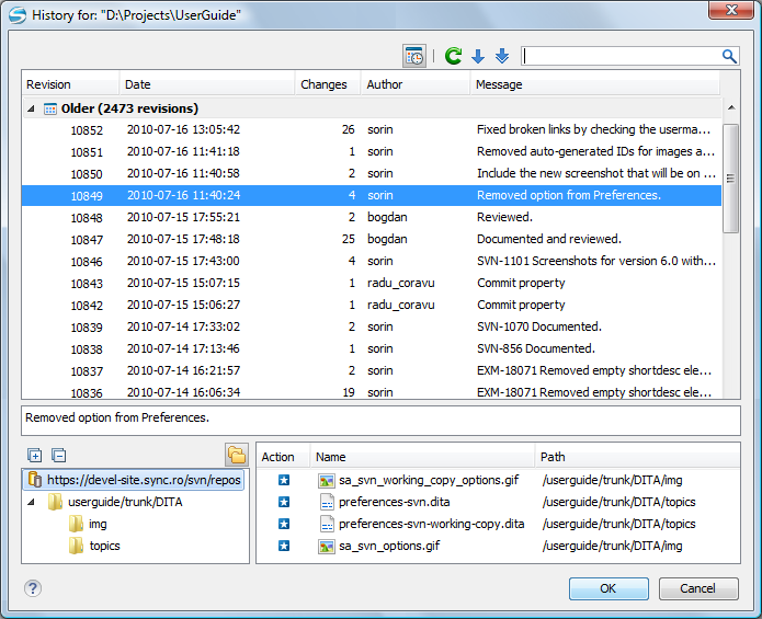 The History dialog box presents a list of revisions for a resource. It is opened from the dialog boxes that require setting an SVN revision number, such as the Check Out dialog box or the Branch / Tag dialog box. It presents information about revision, commit date, author, and commit comment.
