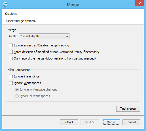 Note:The depth term is described in the Sparse checkouts section. The default depth is the current depth of the working copy item receiving the merge. - Ignore ancestry / Disable merge