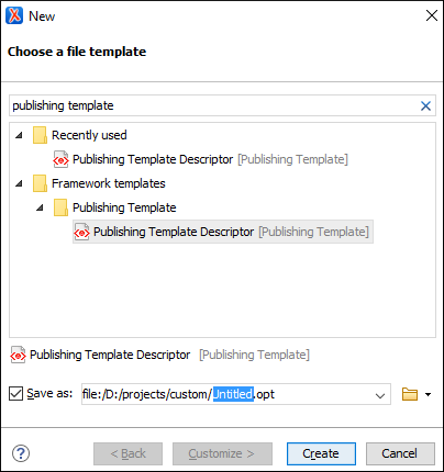 - Open the transformation scenario dialog box and select the publishing template you want to export and use as a starting point.