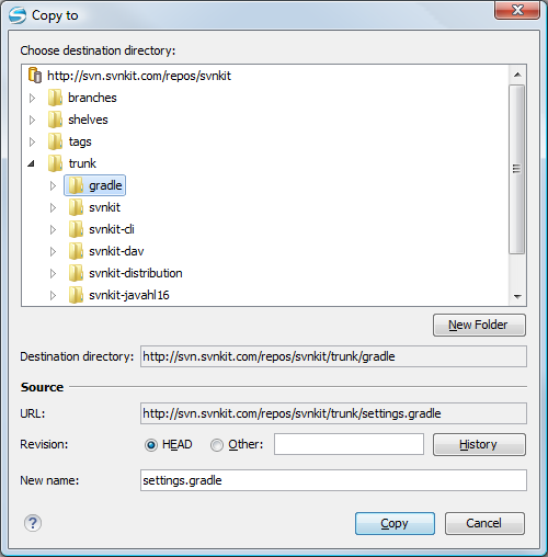 The dialog box used to copy or move items allows you to browse the HEAD revision of the repository and select the destination of the items, presenting its repository URL below the tree view.