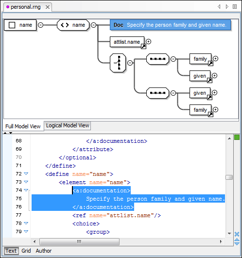 When you create a new schema document or open an existing one, the editor panel is divided in two sections: one containing the schema diagram and the second the source code. The schema diagram editor has two tabs that offer a Full Model View and Logical Model View.