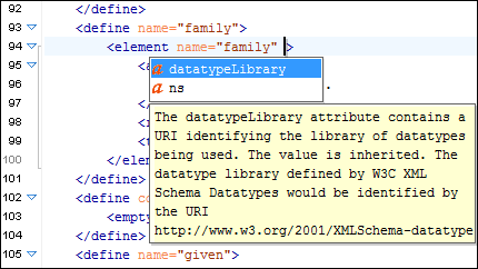 The intelligent Content Completion Assistant allows you to quickly identify and insert elements, attributes, and attribute values that are valid in the current editing context. All available proposals are listed in a pop-up menu displayed at the current cursor position.