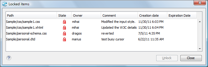 The Locked items dialog box contains a table with all the resources that were found locked on the repository. For each resource there are specified: resource path, state of the lock, owner of the lock, lock comment, creation and expiration date for the lock (if any).