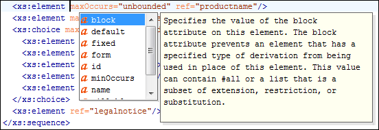 The Content Completion Assistant feature is schema-driven and the list of proposals in the Content Completion Assistant depend on the associated schemas (DTD, XML Schema, Relax NG, or NVDL schema). For information about the various ways to associate a schema and the order of their precedence, see the Associating a Schema to XML Documents section.