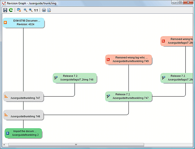 In every node of the revision graph an icon and the background color represent the type of operation that created the revision represented in that node. The commit message associated with that revision, the repository path, and the revision number are also contained in the node. The tooltip displayed when the mouse pointer hovers over a node specifies the URL of the resource, the SVN user who created the revision of that node, the revision number, the date of creation, the commit message, the modification type and the affected paths.