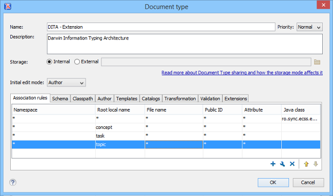 The Document Type Configuration dialog box allows you to create or edit a framework (document type). It is displayed when you use the New, Edit, Duplicate, or Extend buttons in the Document Type Association preferences page (open the Preferences dialog box and go to Document Type Association).