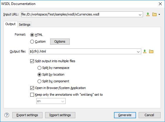 menu. - Split output into multiple files - Instructs the application to split the output into multiple files. For large WSDL documents, choosing a different split criterion may generate smaller output files providing a faster documentation browsing. You can choose to split them by namespace, location, or component name.