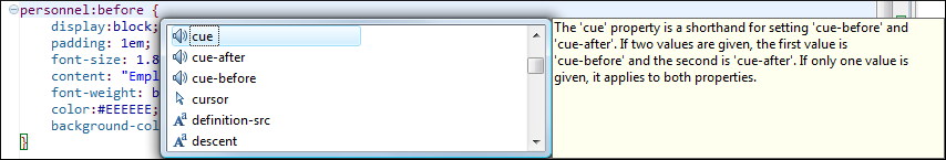 A Content Completion Assistant, similar to the one available for XML documents, offers the CSS properties and the values available for each property. It can be manually activated with the Ctrl + Space shortcut and is context-sensitive when invoked for the value of a property. The Content Completion Assistant also includes code templates that can be used to quickly insert code fragments into CSS stylesheets. The code templates that are proposed include form controls, actions, and Author mode operations.