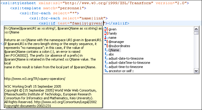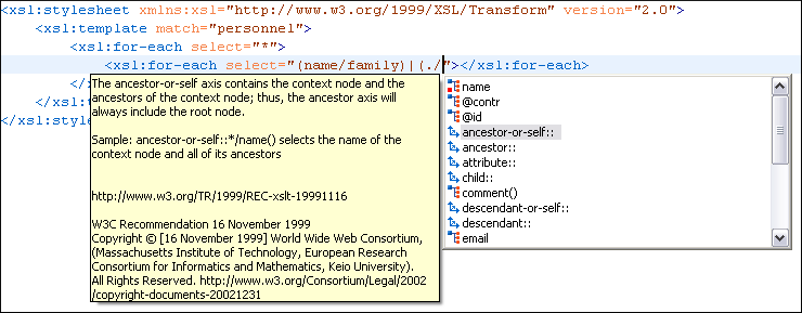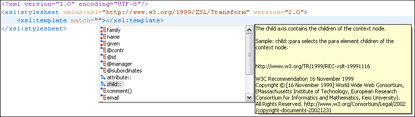- The XPath Content Completion Assistant automatically displays a pop-up window with all the XSLT axes, XPath functions and elements and attributes from the XML input document that can be inserted in the current context.