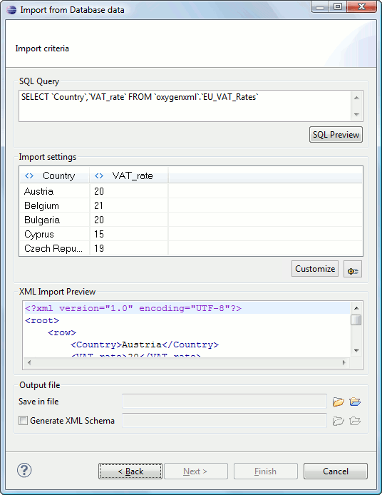 - The XML Import Preview panel contains an example of what the generated XML document looks like.
