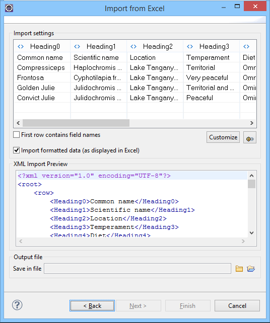 - If this option is selected, the default column headers are replaced (where such information is available) by the content of the first row. In other words, the first row is interpreted as containing the field names. The changes are also visible in the preview panel.