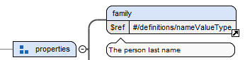 A schema diagram contains a series of interconnected components. In the JSON Schema Design mode, each component is displayed with distinguishable graphics and the thickness of the lines that connect the components identify whether the connected component is required or optional (a thick line denotes a required component while a thin line denotes an optional component).
