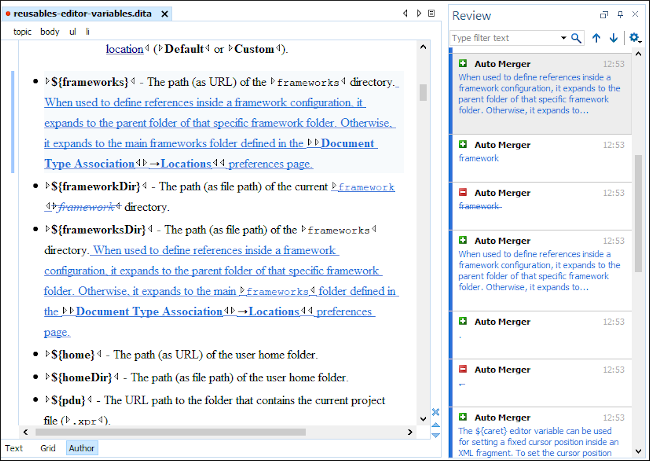 bool_option true|falseare accepted and interpreted accordingly. - Once the merge operation is complete, a report file is created and saved in the output directory (in a separate subdirectory named ".__OXY__MERGE__REPORT"). Loading the report file in Oxygen XML Developer Eclipse plugin provides additional functionality. Aside from the fact that the report provides an overview of the merge process, it also provides links to all the files in the resulting output directory. You can use the respective links to load the XML files in the editor, then switch to Author mode to review the tracked changes and accept or reject them.