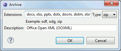 This table contains all known archive extensions mapped to known archive formats. Each row maps a list of extensions to an archive type supported in Oxygen XML Developer Eclipse plugin. You can use the