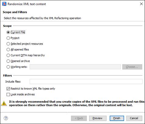 - Allows you to select the set of files whose text content will be randomized by the operation. You can select from predefined resource sets (such as the current file, your whole project, the current DITA map hierarchy for DITA projects, etc.) or you can define your own set of resources by creating a working set.