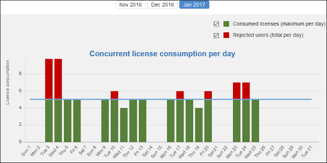 Concurrent license consumption per day - A chart that shows the peak number of licenses that were consumed and the total number of users that were rejected, on a daily basis. This chart can be used to detect the amount of concurrent licenses that are needed to avoid having rejected users.Tip:You can click on any bar to see the license consumption per hour for that particular day.