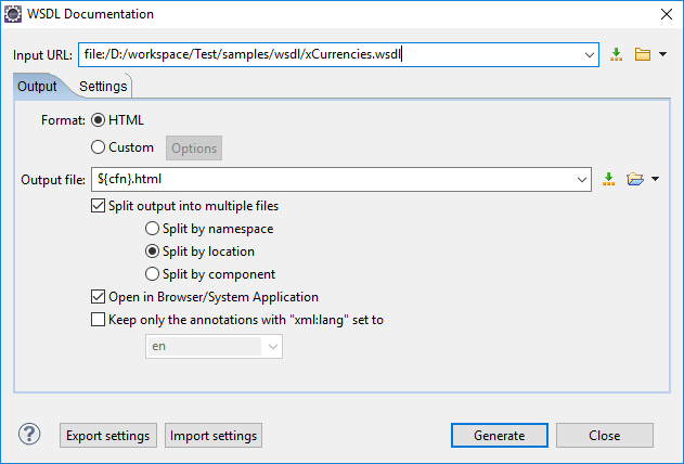 menu. - Split output into multiple files - Instructs the application to split the output into multiple files. For large WSDL documents, choosing a different split criterion may generate smaller output files providing a faster documentation browsing. You can choose to split them by namespace, location, or component name.