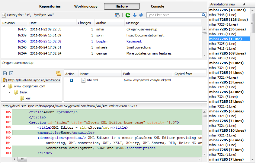 Once you have configured the options and click OK, the Annotations view is displayed (by default, on the right side of the application). You can click a line in the editor panel where the file is opened to see the revision where the line was last modified. The same revision is highlighted in the History view and you can also see all the lines that were changed in the same revision highlighted in the editor panel. Also, the entries of the Annotations view corresponding to that revision are highlighted. Therefore, the Annotations view, History view, and annotations editor panel are all synchronized. Clicking a line in one of them highlights the corresponding lines in the other two.