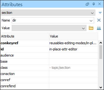 The Attributes view presents all the attributes of the current element determined by the schema of the document. By default, it is located on the right side of the editor. If the view is not displayed, it can be opened from the menu.