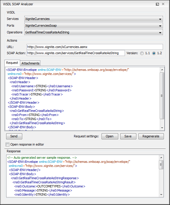 - Response Area - Initially it displays an auto generated server sample response so you can have an idea about how the response looks like. After pressing the Send button, it presents the message received from the server in response to the Web Service request. It may show also error messages. If the response message contains attachments, Oxygen XML Editor prompts you to save them, then tries to open them with the associated system application.