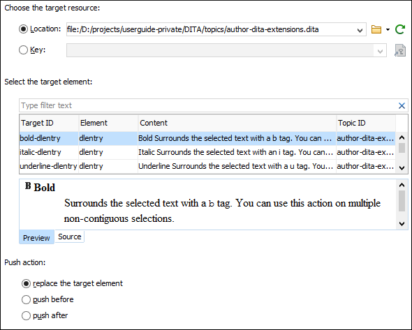 You can also use the Preview panel to view the content that will be pushed and the Source panel to see the XML code for the content to be pushed. After you click OK, the conref push mechanism is inserted in the current document. The changes in the target resource will be processed when you transform the DITA map.