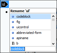 One of the most useful features in Author mode is the Content Completion Assistant. It offers a list of elements, attributes, attribute values, and other options that are valid in the current editing context.
