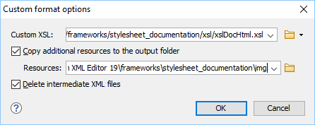 - In this next dialog box, specify your own stylesheet to transform the intermediary XML generated in the documentation process.