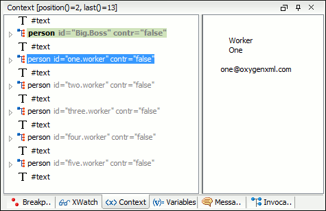 The context node is valid only for XSLT debugging sessions and is a source node corresponding to the XSL expression that is evaluated. It is also called the context of execution. The context node implicitly changes as the processor hits various steps (at the point where XPath expressions are evaluated). This node has the same value as evaluating '.' (dot) XPath expression in XWatch view. The value of the context node is presented as a tree in the Context view. If the view is not displayed, it can be opened by selecting it from the menu.
