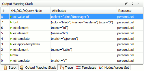 The Output Mapping Stack view displays context data and presents the XSLT templates/XQuery elements that generated specific areas of the output. If the view is not displayed, it can be opened by selecting it from the menu.
