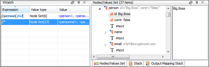 - If the expression result type is a Node Set, click it (Value column) and its value is displayed in the Nodes/Values Set view.
