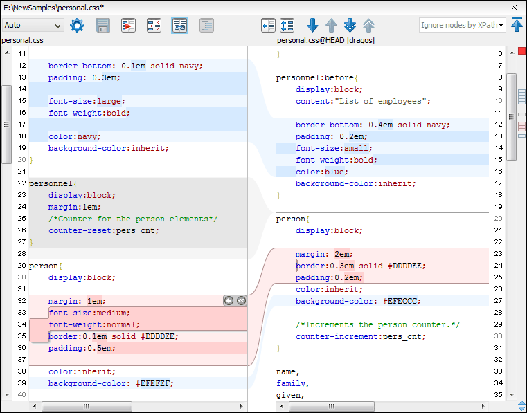 At the top of each of the two editors, there are presented the name of the open file, the corresponding SVN revision number (for remote resources) and the author who committed the associated revision.