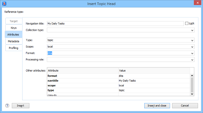 Those actions open the Insert Topic Head dialog box that allows you to easily insert a <topichead> element. A Navigation title (@navtitle attribute) is required but other attributes can also be specified from this dialog box (such as Type, Scope, Format, etc.)