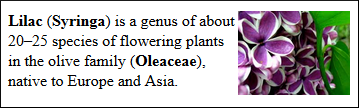 <b>Lilac</b> (<b>Syringa</b>) is a genus of about 20–25 species of flowering plants