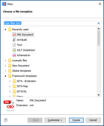 You can either create a new XML document from scratch by choosing one of the available types in the wizard. You can also create one from a template by choosing a template from the Global templates or Framework templates folders. If you are looking for a common document type, such as DITA or DocBook, you can find templates for these document types in the Framework templates folder. If your company has created its own templates, you can also find them there. After you use this dialog box to create a few documents, those document types will appear in the Recently used folder, which allows you to easily create other new documents of those types.