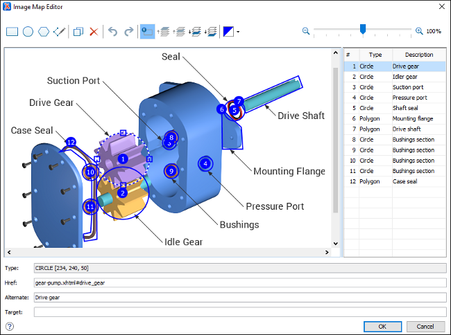This main Image Pane is where you work with shapes to add hyperlinks to multiple areas within an image. The editing mechanisms that are supported in the Image Pane include the following: