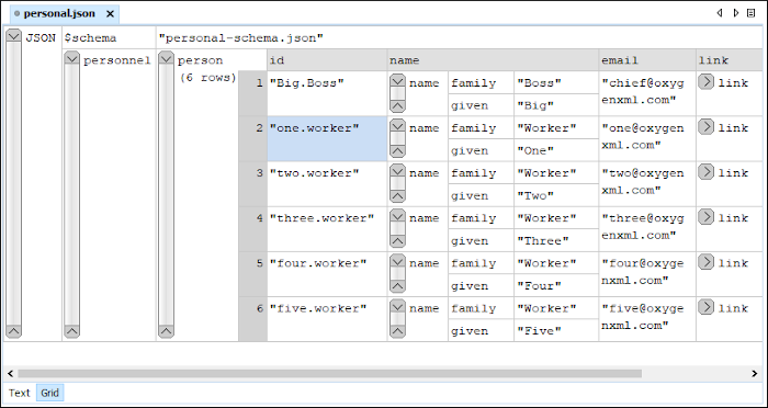 Oxygen XML Editor allows you to view and edit the JSON documents in the Grid mode. The JSON is represented in Grid mode as a compound layout of nested tables and the JSON data and structure can be easily manipulated with table-specific operations or drag and drop operations on the grid components.