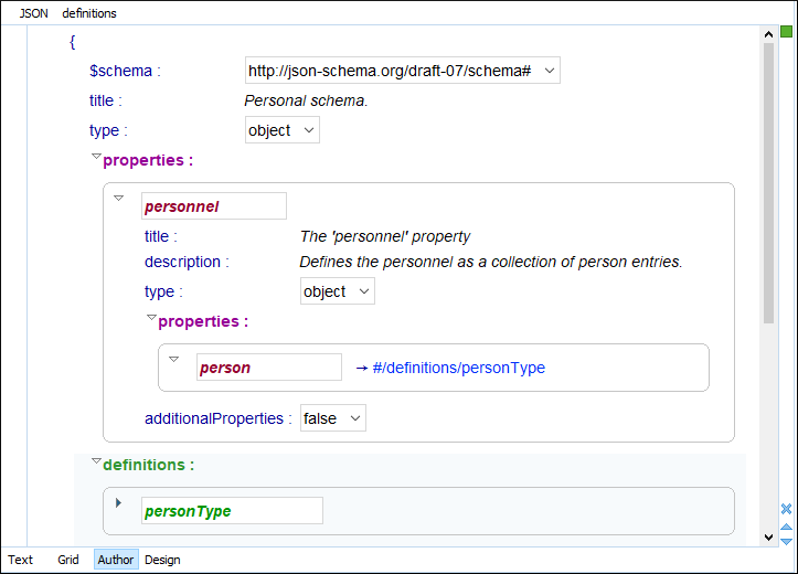 Oxygen XML Editor allows you to view and edit the JSON Schema documents in the Grid mode. The JSON Schema is represented in Grid mode as a compound layout of nested tables and the JSON data and structure can be easily manipulated with table-specific operations or drag and drop operations on the grid components. For more details, see JSON Grid Mode Editor.