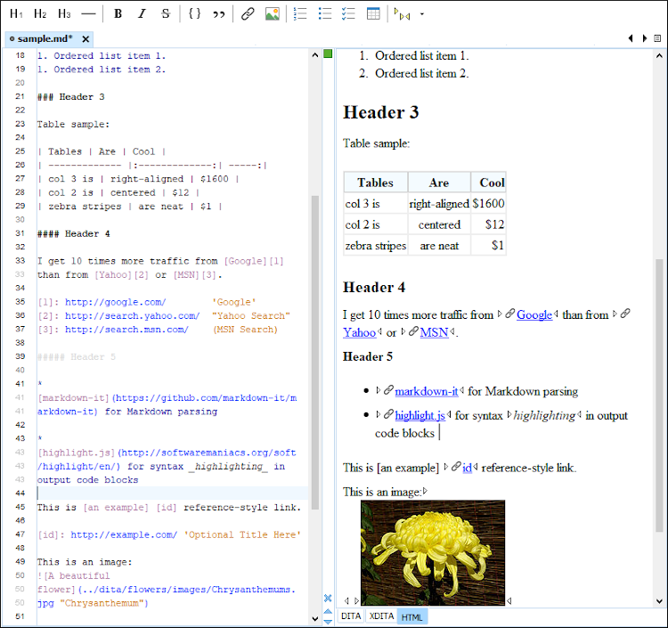 the amount of markup that is displayed in the Preview pane. - Specialized DITA Features - The Markdown editor includes some unique, specialized features to integrate it with the powerful DITA support in Oxygen XML Editor.