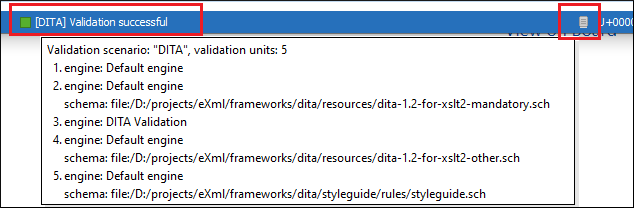- A success indicator square will turn green if the validation is successful or only info messages are found, red if validation errors are found, or yellow if only validation warnings are found. More details about the issues are displayed in a tooltip when you hover over indicator square. If there are numerous problems, only the first three are presented in the tooltip.