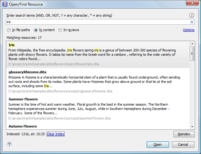 - Options - Opens the Open/Find Resource preferences page where you can configure various search options. For example, you can specify a Content language that differs from the default UI language in case your document contains multiple languages.