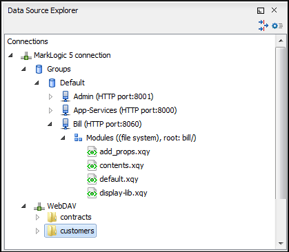 The objects (nodes) that are displayed in the Data Source Explorer view depend on the connection type and structure of the database. Various contextual menu actions are available for each hierarchical level and for some connections you can add or move resources in a container by simply dragging them from the Project view, a file browsing application, or another database.