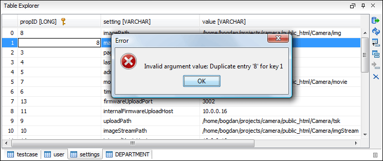 propIDcolumn to 8, results in a duplicate entry error since that value has already been used in the first record:Figure 3. Duplicate Entry for Primary Key