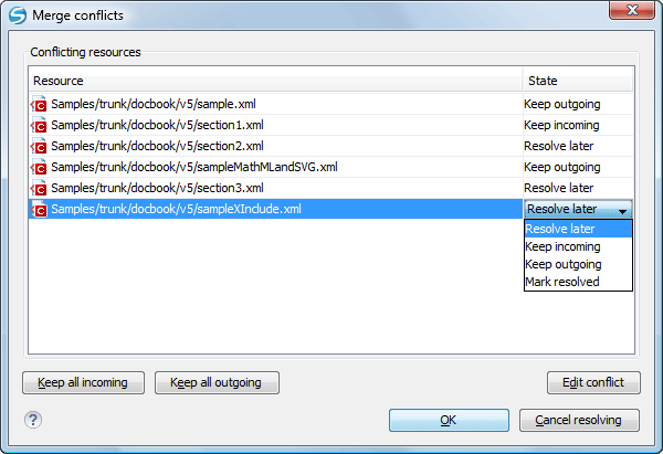 After the merge operation is finished, it is possible to have some items in conflict. This means that some incoming modifications for an item could not be merged with the current working copy version. If there are such conflicts, the Merge conflicts dialog box will appear, presenting the items that are in conflict. This dialog box offers you choices for resolving the conflicts.
