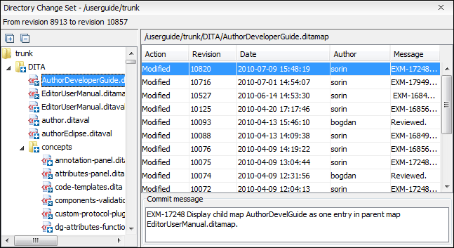The left side panel of the view contains the tree hierarchy with the names of all the changed resources between the two reference revision numbers. The right side panel presents the list with all the revisions of the resource selected in the left side tree. These revisions were committed between the two reference revision numbers. Selecting one revision in the list displays the commit message of that revision in the bottom area of the right side panel.