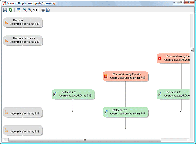 In every node of the revision graph an icon and the background color represent the type of operation that created the revision represented in that node. The commit message associated with that revision, the repository path, and the revision number are also contained in the node. The tooltip displayed when the mouse pointer hovers over a node specifies the URL of the resource, the SVN user who created the revision of that node, the revision number, the date of creation, the commit message, the modification type and the affected paths.
